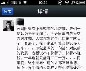 不论是《80后网上卖烧烤年赚百万:用微信送餐玩转O2O》 还是《雕爷牛腩就是这样做到了估值4亿》, 我认为,他们的案例都不具备普适性与复制性,富二代在淘宝卖烧烤,退休阿姨用微信送快餐,雕爷牛腩花费500万买秘方——你看懂什么了吗?这些创业故事只能是故事,和创业本身没有太多关系,直到我看到了这条微信朋友圈: